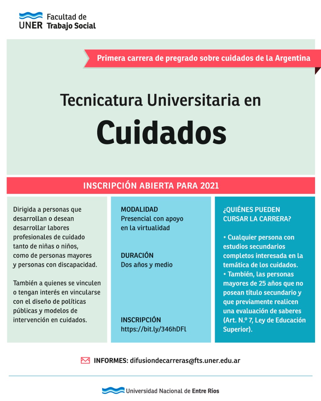 La Facultad de Trabajo Social (FTS) de la UNER presenta una nueva carrera: la Tecnicatura Universitaria en Cuidados. Se trata de la primera propuesta de pregrado del país orientada a formar a quienes trabajan o desean trabajar en el cuidado de niñas y niños, personas mayores y personas con discapacidad.